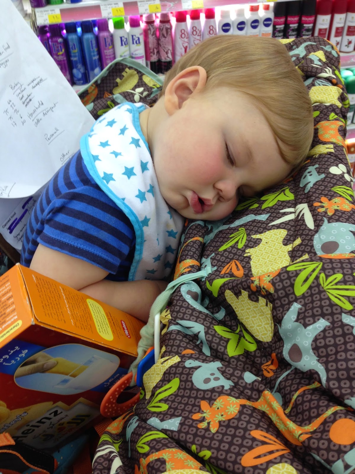 I was out doing my weekly grocery shopping when I turned around to this cute sight! Eden out for the count! This kiddo must have been dead tired!